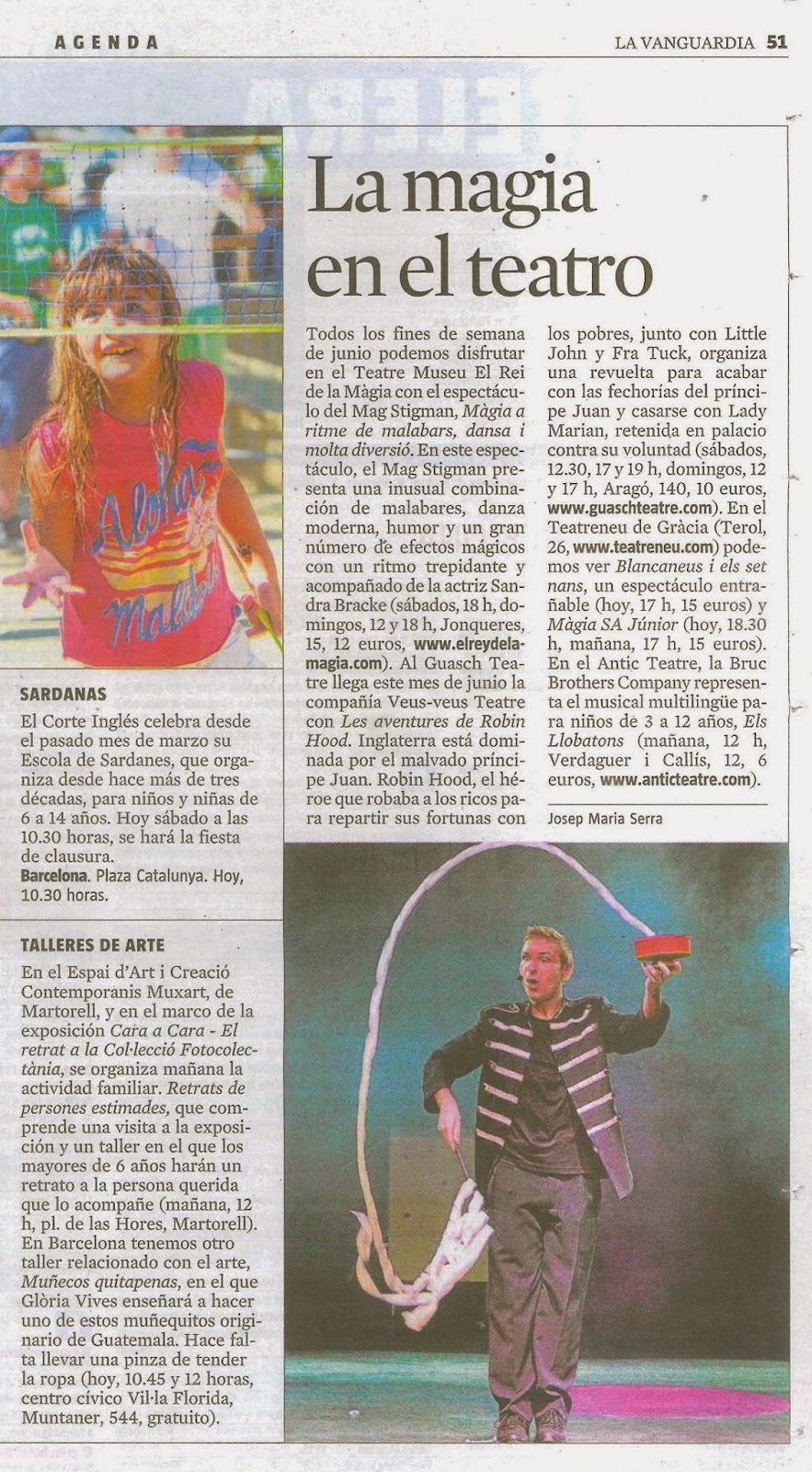 Aquí us mostrem la notícia del passat dissabte 7 de juny. Josep Maria Serra, periodista de La Vanguardia, va destacar l’espectacle del Mag Stigman com una de les principals propostes per fer amb nens durant el cap de setmana. La cartellera d’activitats amb la canalla mostrava la foto de l’artista realitzant un dels principals efectes del seu show. La imatge anava acompanyada d’un text on s’especificava que durant tots els caps de setmana de juny es podia gaudir d’aquest espectacle al Teatre Museu del Rei de la Màgia.