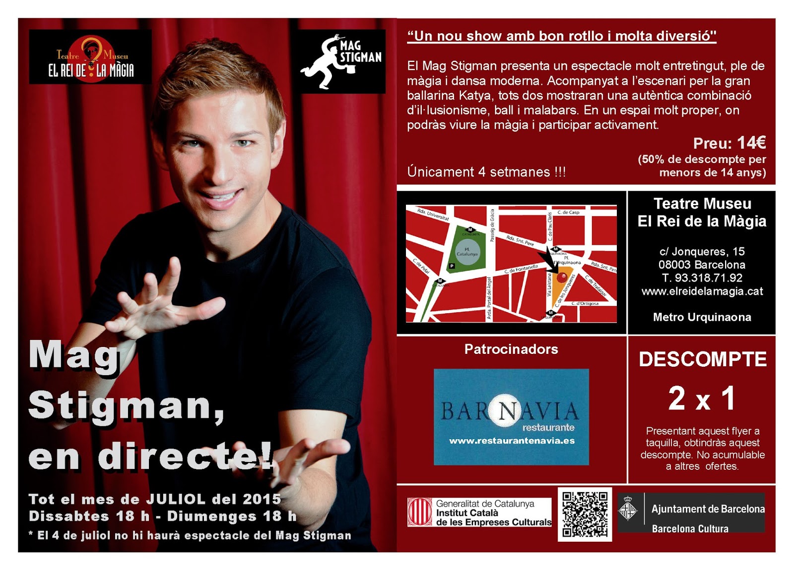 Mag Stigman, en directe! és el títol d’aquesta proposta que la nostra companyia va estrenar recentment. En aquesta nova representació, l’artista estarà acompanyat a l’escenari per la gran ballarina Katya(personatge interpretat per Maria Voronkova). Es tracta d’una combinació d’il·lusionisme, ball i malabars, que garanteix bon rotllo i molta diversió per a tota la familia. Molt visual, dinàmic, entretingut, ple de nous efectes màgics i dansa moderna.