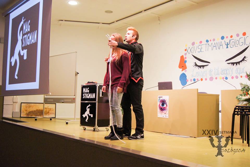 El passat divendres 20 de novembre del 2015, la Universitat Rovira i Virgili (URV) de Tarragona, una de les set universitats públiques de Catalunya, va acollir la conferència-espectacle del Mag Stigman, «Màgia i Psicologia«. Aquest va ser l’acte de cloenda de la Setmana Psicològica. L’Aula Magna de la Facultat de Ciències de l’Educació i Psicologia, va acollir durant dues hores, una proposta dinàmica i entretinguda que combina l’explicació dels mecanismes psicològics que s’utilitzen en el món de l’il•lusionisme, juntament amb la realització d’efectes de màgia.
