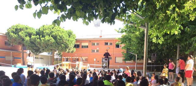 Així, aquell dia pel matí, vam preparar tot el nostre material en una tarima situada al pati de l’escola i vam realitzar dues actuacions del nostre espectacle de màgia i animació. A les 10h vam començar el primer passe que anava destinat als alumnes del cicle infantil, i a les 11h va donar inici la representació dirigida als alumnes d’educació primària.