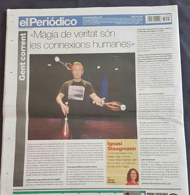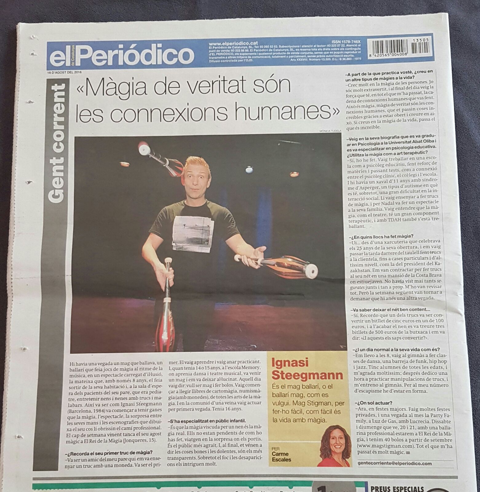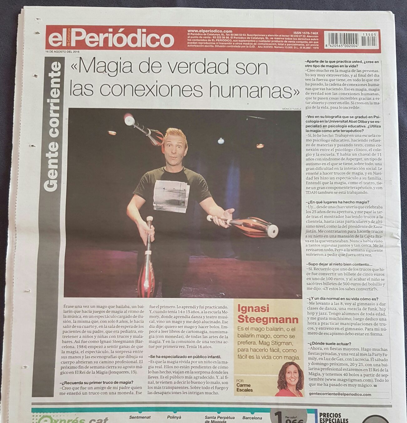 Aquest passat dimarts 16 d’agost del 2016, El Periódico de Catalunya dedicava la contraportada d’aquest important diari a entrevistar al Mag Ignasi Stigman. La secció Gente Corriente que és una de les parts més llegides pels subscriptors i lectors del Periódico i que cada dia realitza una entrevista a algun personatge que estigui d’actualitat, va omplir-se de màgia per tractar com havia estat la vida i com és l’actualitat del Mag Stigman.
