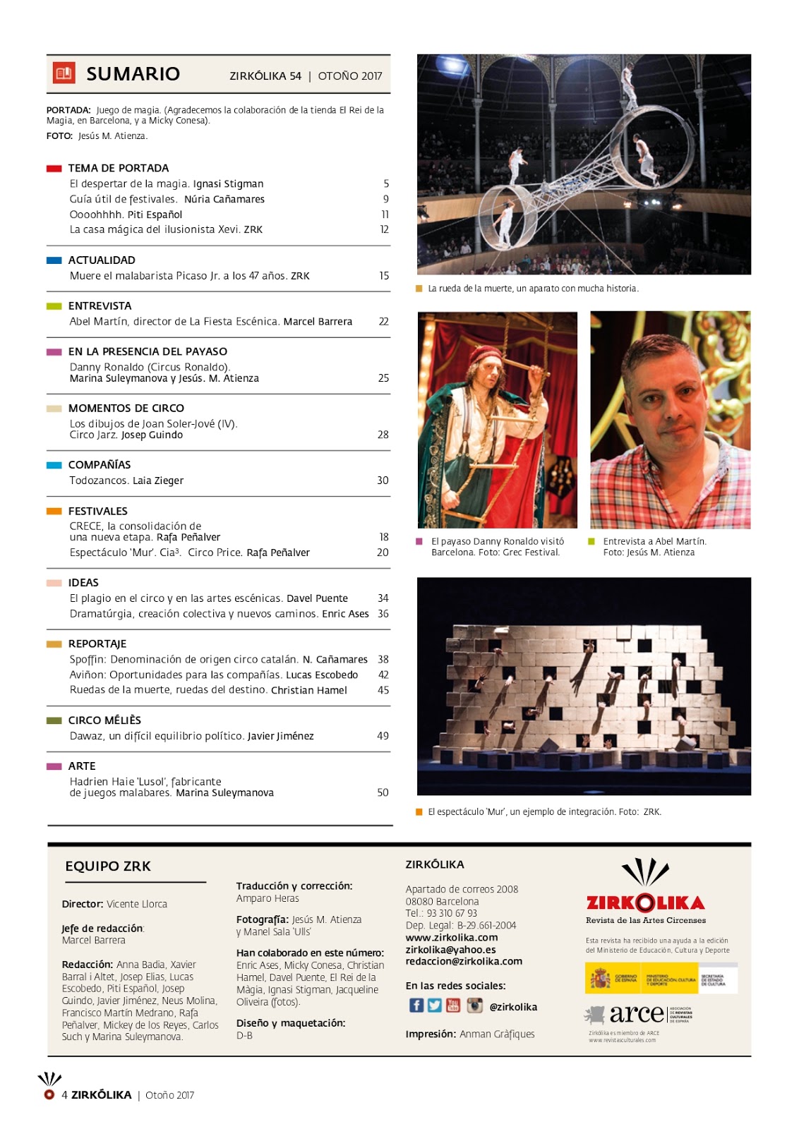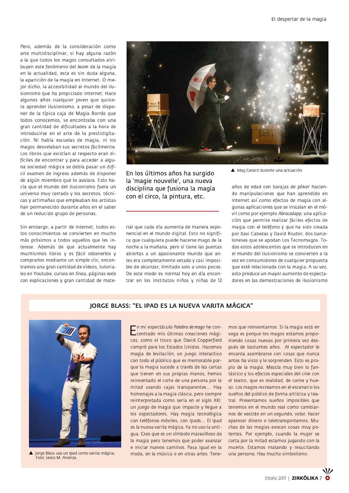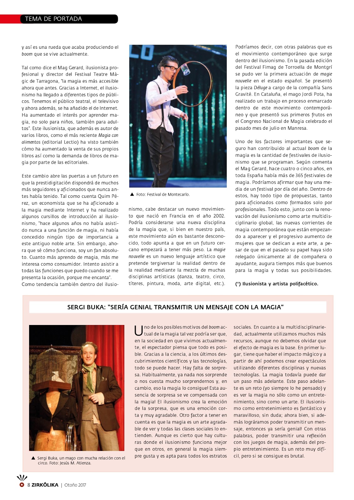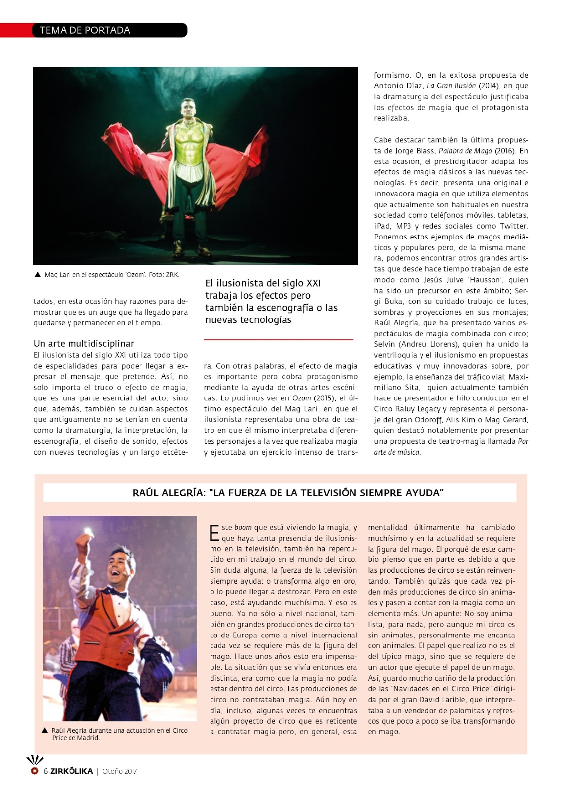 Zirkólika es la revista del mundo del circo, una revista trimestral especializada en las artes circenses, con una edición muy cuidada y que se publica impresa en castellano y en catalán. Nuestro mago Ignasi Stigman, conocido artísticamente como Mag Stigman, es colaborador habitual de la revista y escribe principalmente sobre circo y magia en esta prestigiosa publicación. En el último número de la revista (54) correspondiente a otoño del 2017, Stigman ha publicado un muy amplio e interesante artículo sobre «El boom de la magia«, que ha resultado ser tema de portada de la revista.