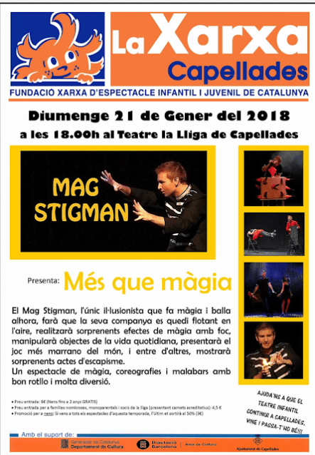 El Mago Stigman, el único ilusionista que hace magia y baila a la vez, hizo un gran espectáculo de magia, coreografías y malabares con muy buen rollo y mucha diversión. Sucedió en el espectáculo «Més que màgia» el pasado 21 de enero de 2018 en el teatro La Lliga de Capellades, invitado por la Fundació Xarxa.