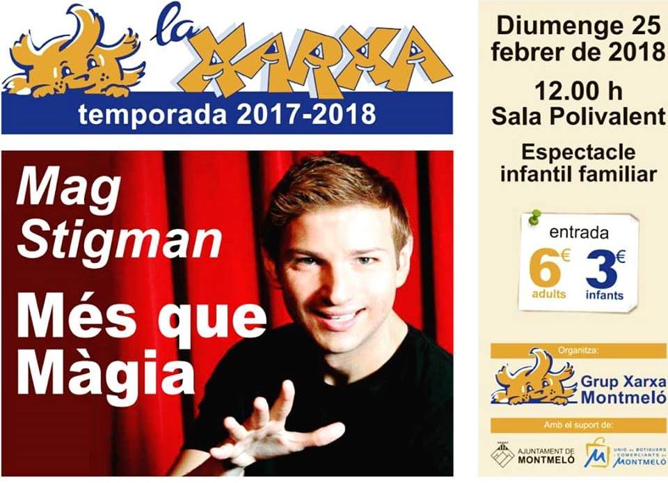 Dentro de la programación familiar de Xarxa Montmeló, el pasado domingo 25 de febrero del 2018 a las 12h, el Mag Stigman representó en la Sala Polivalent de Montmeló nuestro espectáculo «Més que Màgia«. El acontecimiento fue un éxito de público y participación.