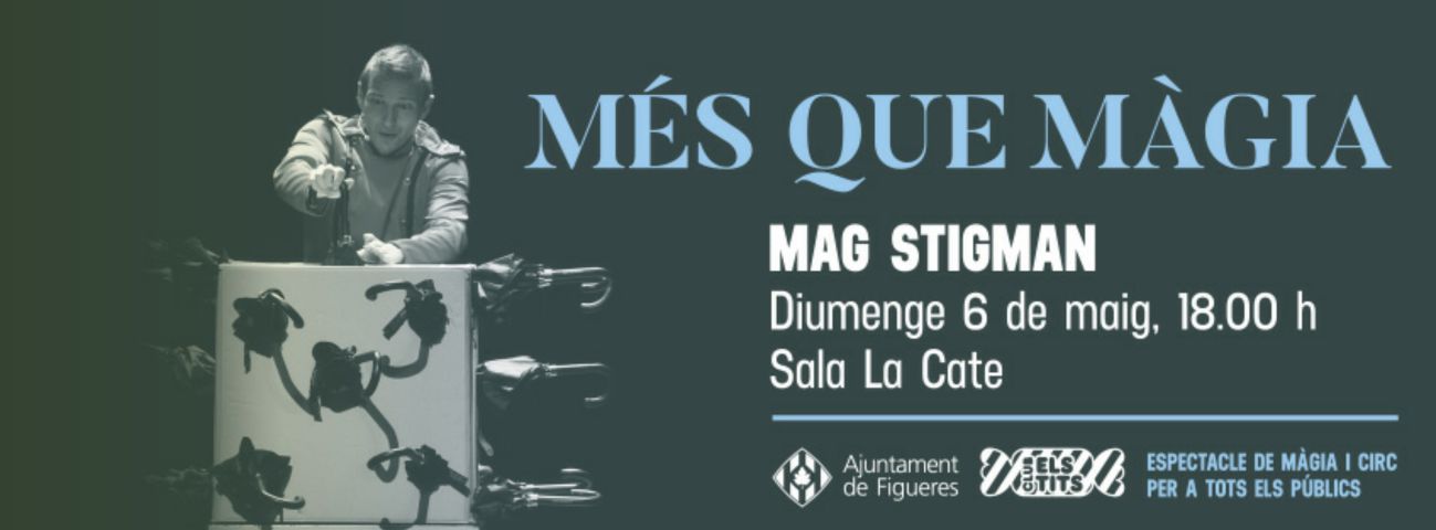 El Mag Stigman actuó el pasado domingo 6 de mayo en la Sala La Cate de Figueres programado por el Ayuntamiento de esta localidad. Minutos antes de empezar la representación, la platea estaba llena de familias y de público de todas las edades que se dejaron llevar por el buen rollo, la magia y la energía de nuestro artista.