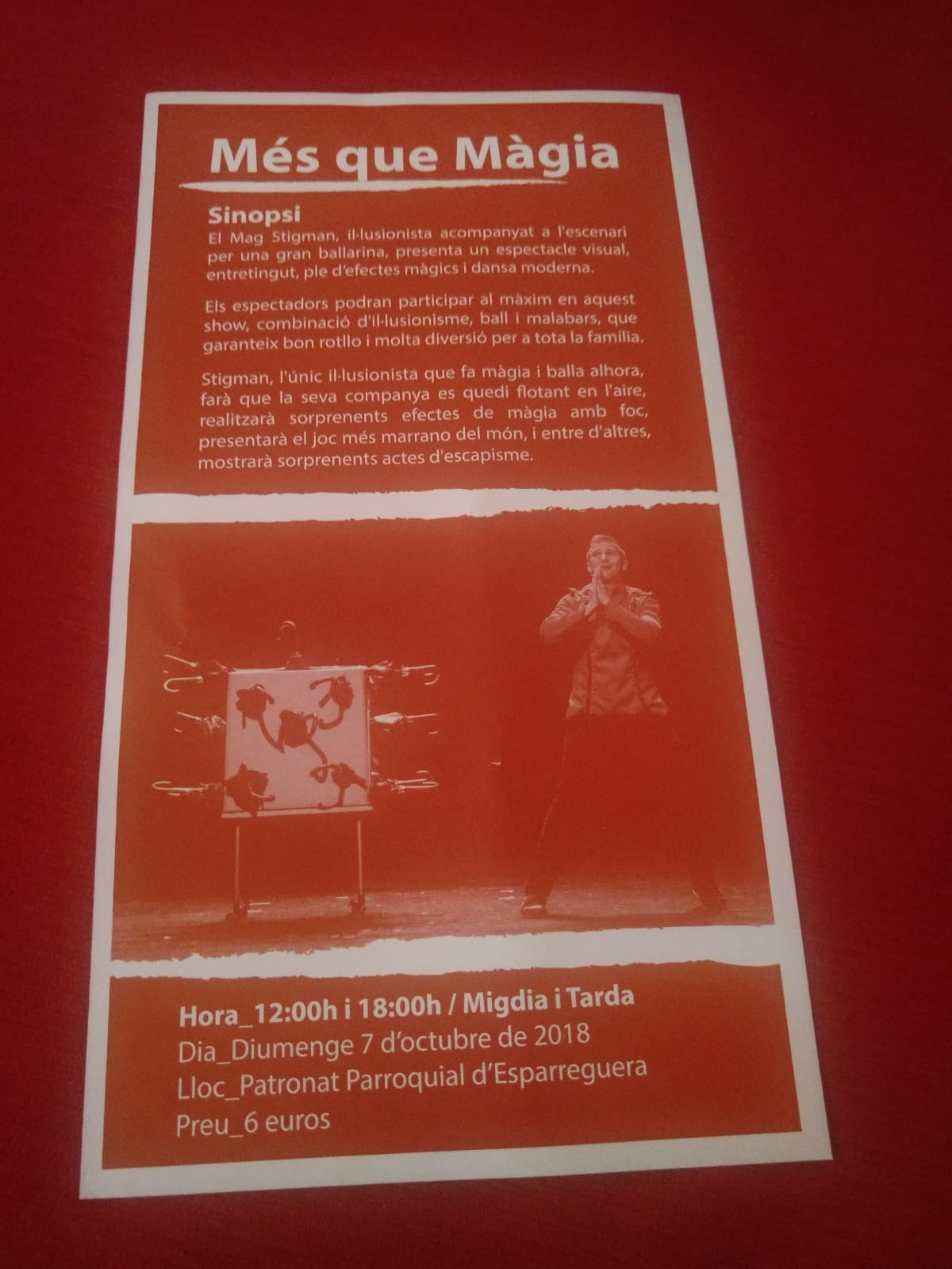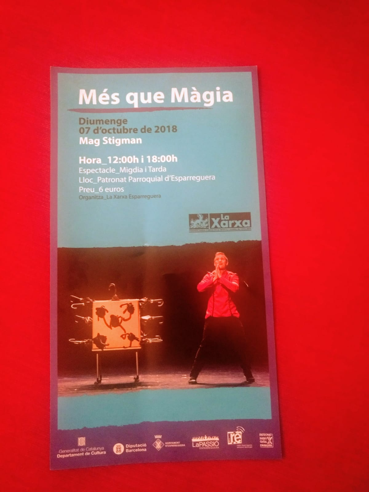 El pasado domingo 7 de octubre del 2018, tuvo lugar la representación de dos funciones del espectáculo «Més que Màgia» del Mago Stigman. Más concretamente, fue en el Teatre Patronat Parroquial de la ciudad de Esparreguera para el grupo Xarxa Esparreguera (que fueron los organizadores del evento). El primer pase se inició a las 12h y el segundo fue por la tarde, a las 18h. Fue un éxito de público y todo el mundo disfrutó del buen rollo, la magia y el baile que caracteriza a nuestra compañía «M de Magia (www.mdemagia.com)».