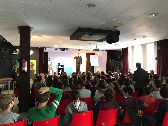 En Blanes, las dos representaciones de este espectáculo didáctico tuvieron lugar en la Escola Cor de Maria para unos 200 alumnos de la ESO. Fue un auténtico placer actuar para ellos. Des de este blog, damos las gracias a todos los alumnos por su tan buena actitud, su buen rollo y su constante interés en el tema. Así como el agradecimiento a los profesores y dirección del centro.