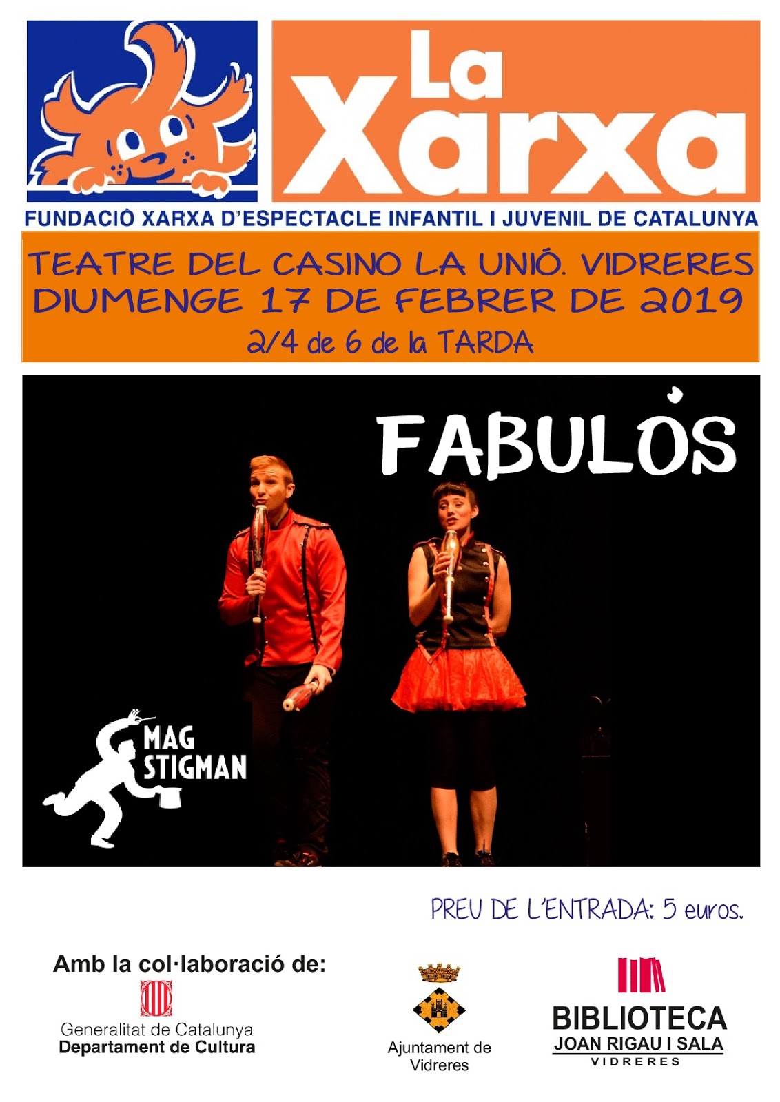 Este espectáculo tuvo lugar dentro ciclo de espectáculos familiares de Xarxa Vidreres y que organiza y programa la prestigiosa Fundació Xarxa de espectáculo infantil y familiar de Cataluña. La propuesta que presenta el ilusionista Stigman está incluida y recomendada dentro del catálogo de dicha fundación, cosa que nos hace muy felices y nos alegra muchísimo.