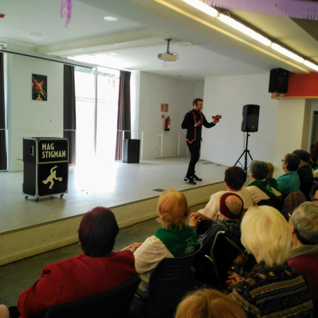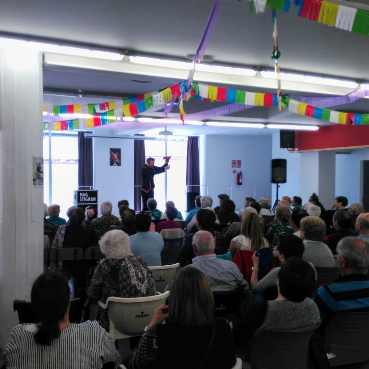 Estamos muy contentos ya que el Casal se llenó de público, repleto, vino mucha gente (algunos de ellos acompañados de sus nietos) y disfrutaron al máximo del espectáculo del ilusionista. Hubo muy buen rollo, los asistentes participaron muy activamente durante todo el show y finalmente, todos acabaron de pie bailando como un gran fin de fiesta.
