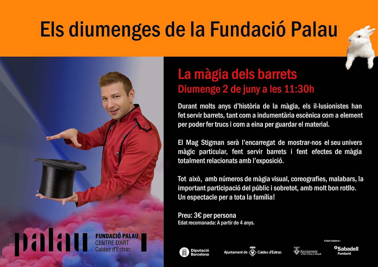 Este pasado domingo 2 de junio del 2019 por la mañana ha tenido lugar en la Fundació Palau i Fabre de Caldes d’Estrac el espectáculo del Mag Stigman titulado «La Màgia dels barrets (La Magia de los sombreros)». Con motivo de la exposición alrededor del sombrero «Chapeau De Casas i Picasso a Balenciaga i Pertegaz» que durante estos meses está expuesta en la fundación, y dentro de los actos de los domingos de la Fundació Palau, se ha realizado este espectáculo de ilusionismo dirigido a toda la familia.