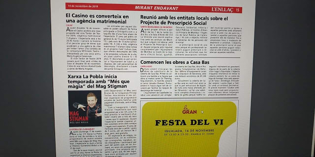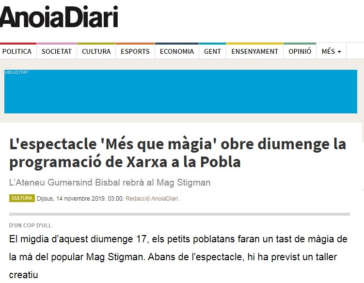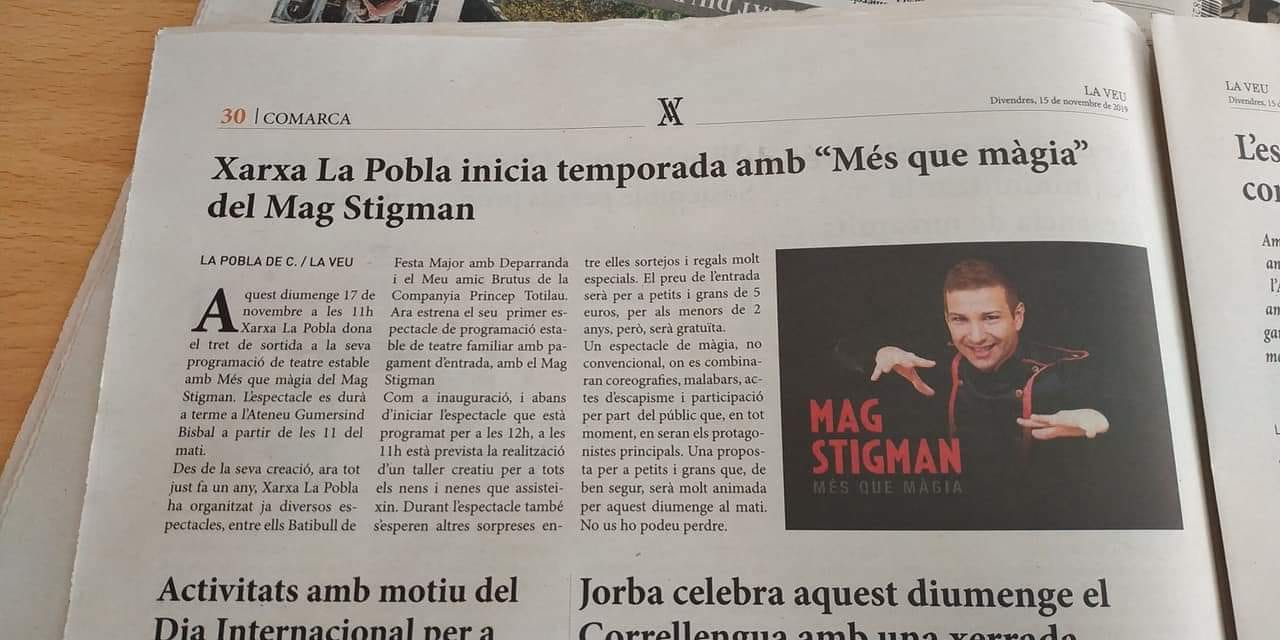 Entre el pasado jueves 14 y sábado 15 de noviembre del 2019, «Més que Màgia«, el espectáculo del Mag Stigman, ha salido en diferentes periódicos locales y comarcales, con motivo de la actuación que el artista realizó el domingo 17 de noviembre en el escenario del Ateneu Gumersind Bisbal para el grupo Xarxa La Pobla de Claramunt. Aquí os mostramos las noticas de «La Veu de l’Anoia«, «AnoiaDiari» y de «L’Enllaç dels Anoiencs«.
