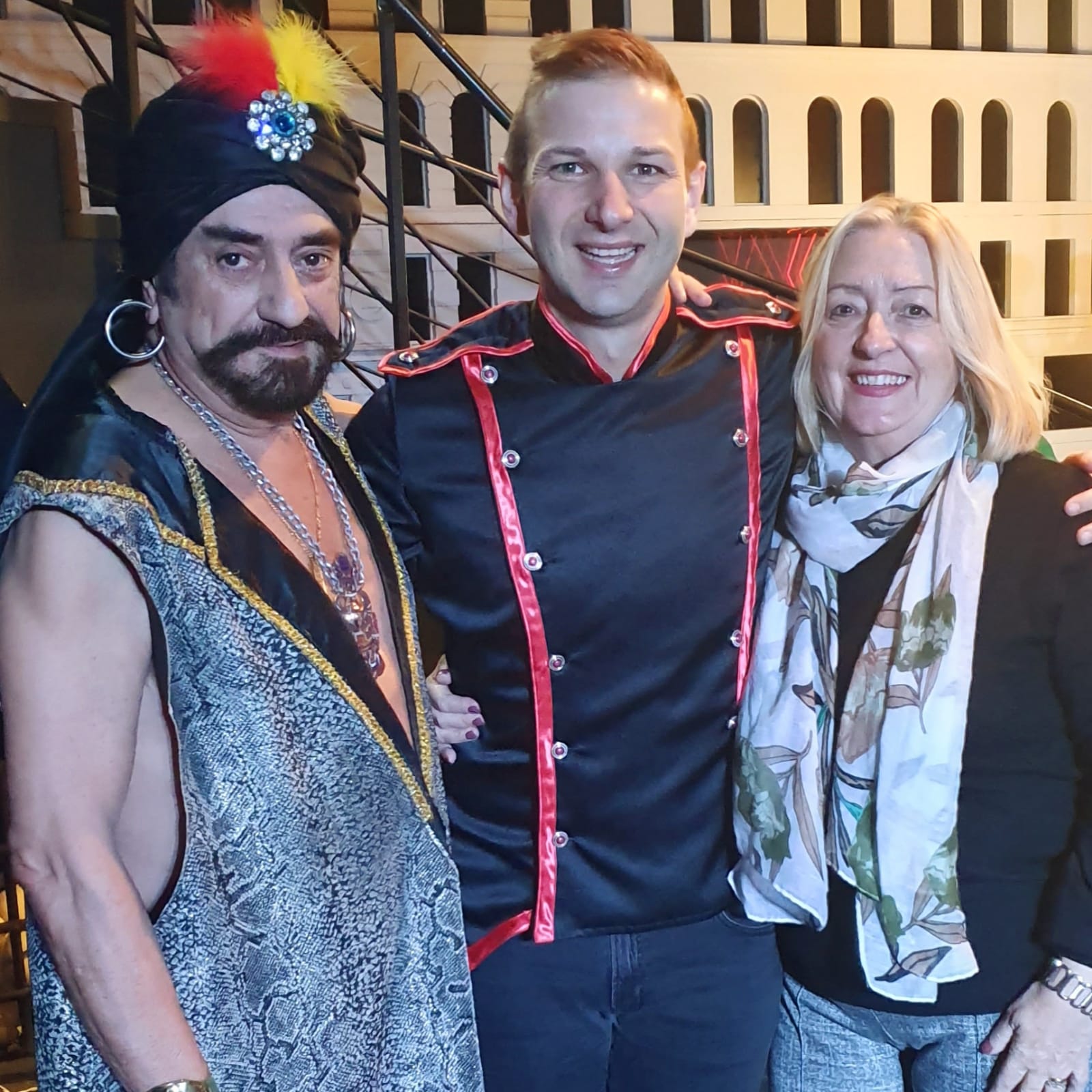 El espectáculo fue una original mezcla de actos de faquirismo con muchos efectos de magia e ilusionismo participativo. Todo con muy buen rollo y generando un ambiente muy festivo. En la foto, podemos ver a Stigman junto al gran Fakir Kirman y su mujer y compañera de aventuras, Mercè. Fue un placer poder volver a actuar para AN Grup y volver a coincidir con Kirman.