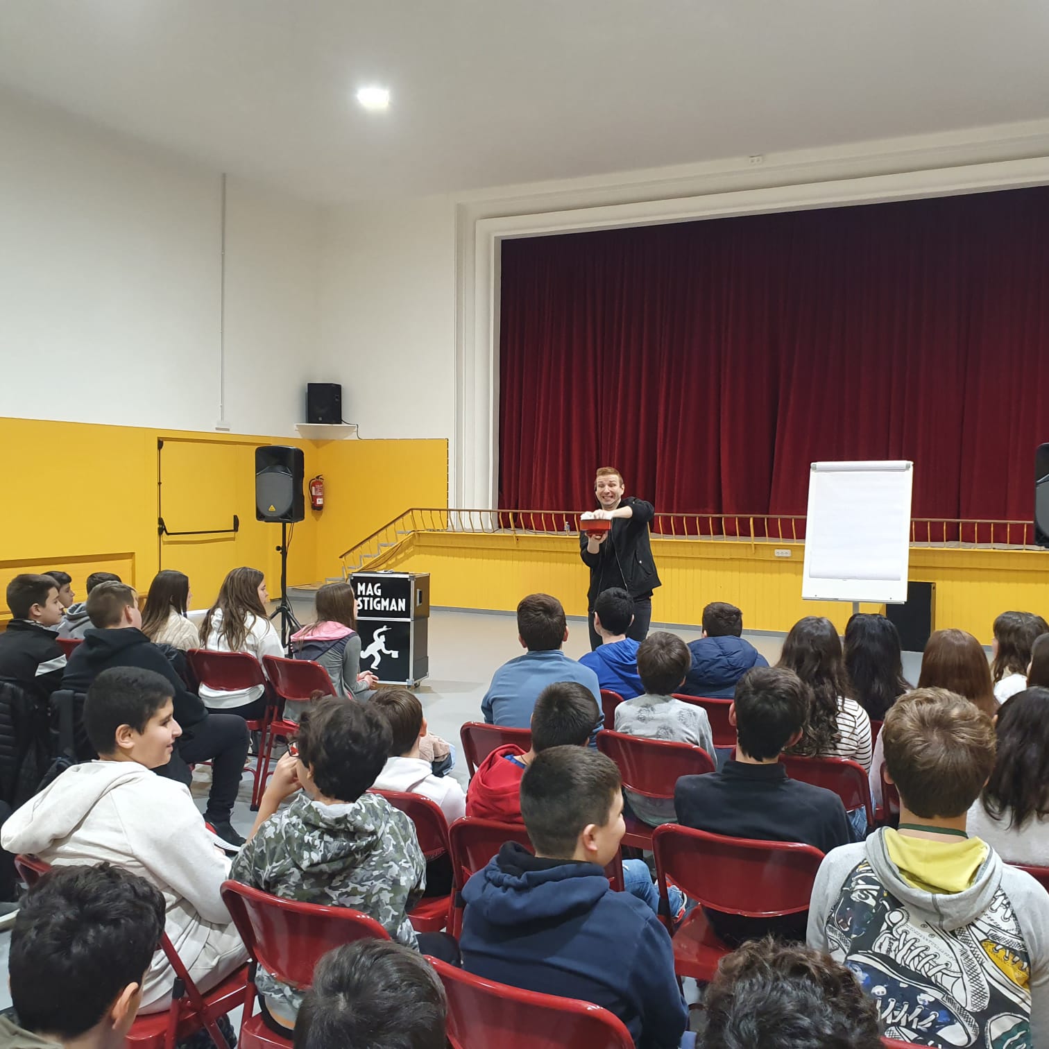 Esta propuesta va dirigida a los alumnos de la ESO y de bachillerato, y además de ser un espectáculo muy divertido y sorprendente, es una actividad completamente pedagógica. Durante 90 minutos, los estudiantes aprenden razonamiento matemático con elementos de álgebra, cálculo, geometría y topología. Todo mediante sorprendentes trucos de magia. El Mag Stigman sorprende a los alumnos con su buen rollo y con su magia. Y a la vez, encanta a los profesores, ya que ven como sus estudiantes muestran atención y aprenden mucho sobre la aplicabilidad de las matemáticas.