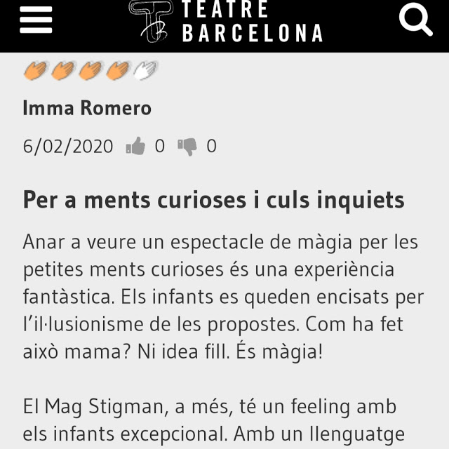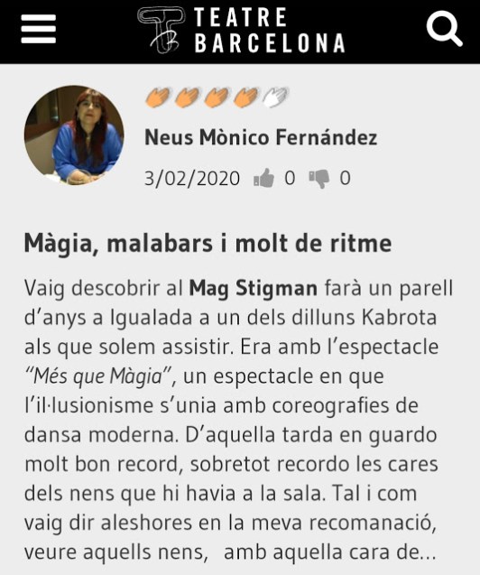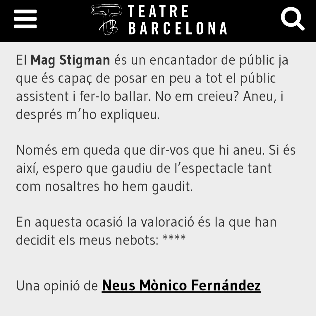 Estamos muy contentos ya que siguen saliendo muy buenas críticas de nuestro último espectáculo «El Circ dels Impossibles«. En esta ocasión, dos colaboradoras de la reconocida web «TeatreBarcelona» han venido a ver el nuevo espectáculo del Mag Stigman. Neus Mònico Fernández e Imma Romero, se acercaron a la Sala Cincómonos de Barcelona para ver la representación que cada sábado a las 19h pone en marcha nuestra compañía y posteriormente han escrito estas dos reseñas que tanta ilusión nos han hecho leer.