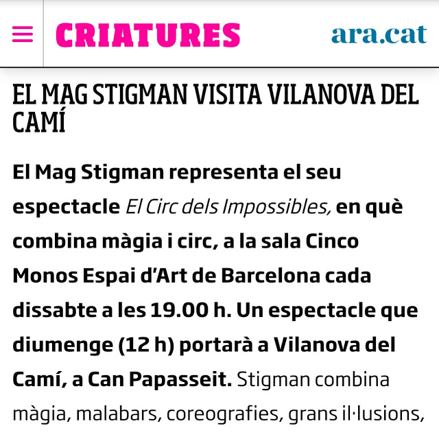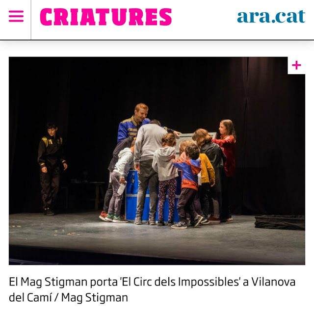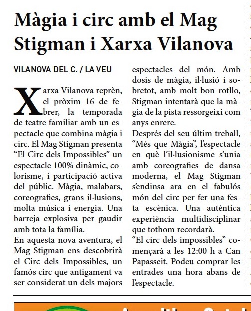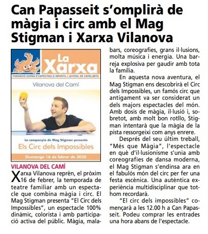Entre el viernes 13 y hoy sábado 14 de febrero del 2020, «El Circ dels Impossibles«, el último espectáculo del Mag Stigman, ha salido en diferentes periódicos comarcales y del país, con motivo de la actuación que el artista realizará mañana domingo 16 de febrero a las 12h en el escenario de Can Papasseit para el grupo Xarxa Vilanova del Camí. Aquí os mostramos las noticas de «L’Enllaç dels Anoiencs«, «La Veu de l’Anoia» y el «AraCriatures» del «Diari ARA«.