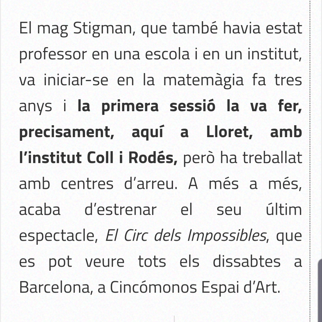 El pasado miércoles 12 de febrero del 2020, el Mago Stigman fue entrevistado por Nova Ràdio Lloret después de las cinco representaciones del espectáculo «Matemagia» que llevó a término para los alumnos de 1º de la ESO del IES Coll i Rodés de Lloret de Mar.