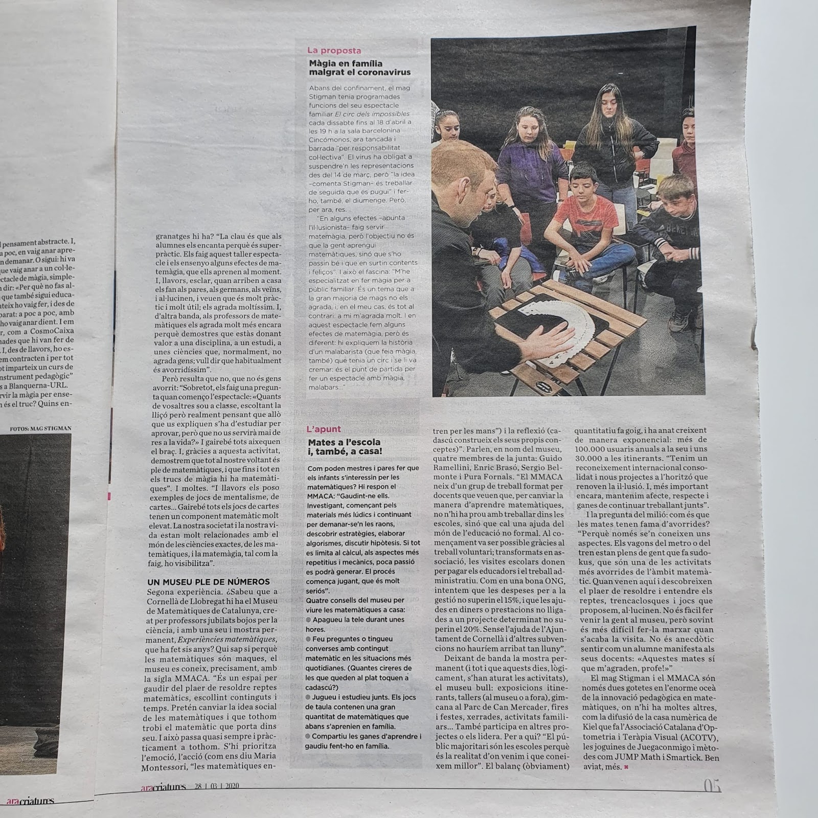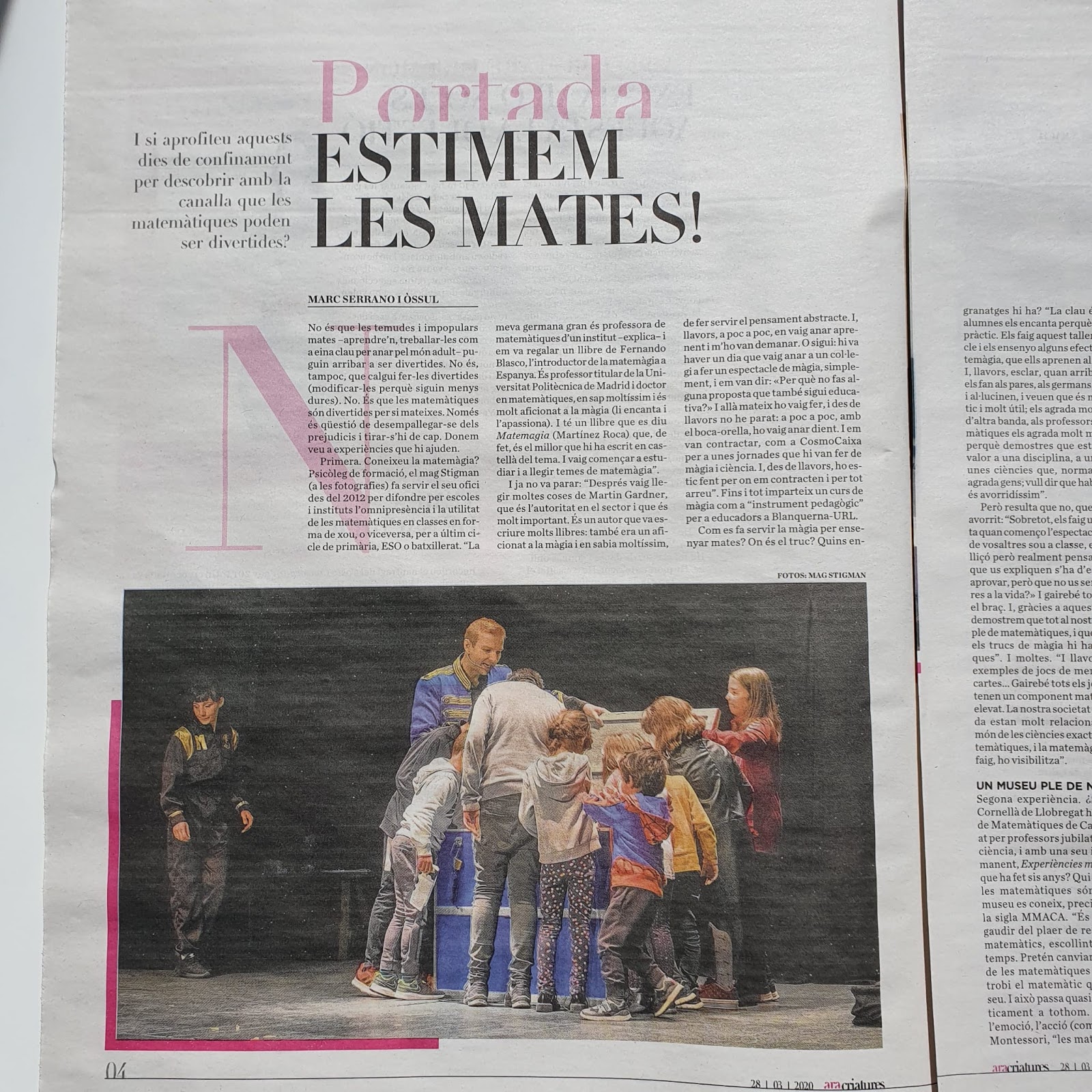El pasado sábado 28 de marzo del 2020, el suplemento ARA Criatures del periódico Diari ARA ha incluido como tema de portada de este número, un fantástico y muy interesante artículo sobre «Matemáticas Lúdicas y Educativas«. El periodista Marc Serrano i Òssul escribe un amplio reportaje que explica detalladamente el espectáculo de «Matemagia» que el Mag Stigman realiza por escuelas e institutos, así como una entrevista al ilusionista en que declara cómo empezó a interesarse por el tema de la magia matemática y cómo se ha formado en ello.