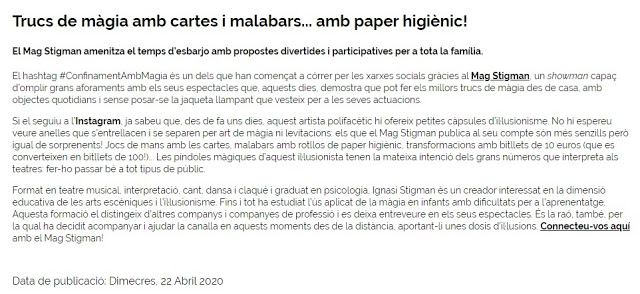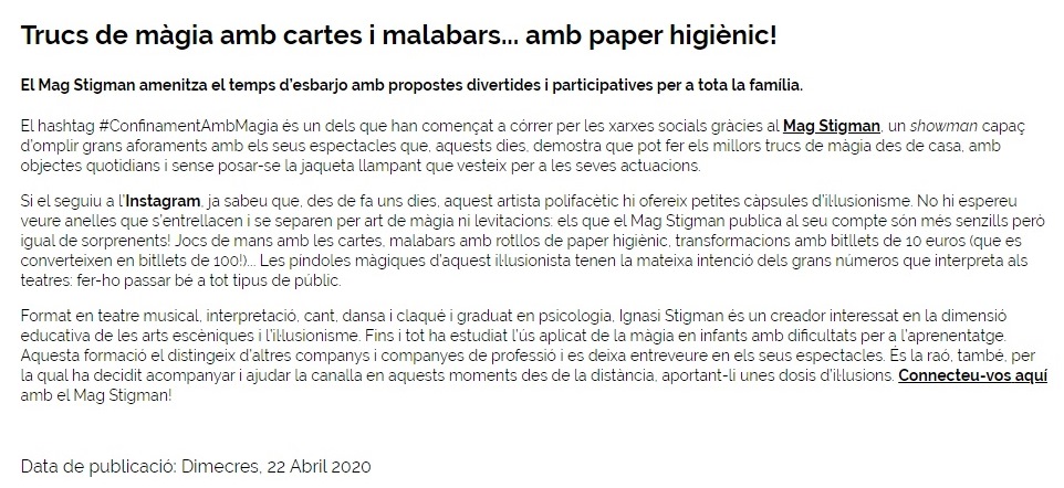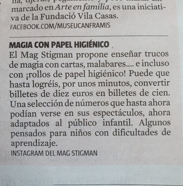 Estamos muy contentos, ya que el pasado viernes 24 de abril del 2020, el periódico «La Vanguardia» destacaba en la agenda del día la actividad que el Mago Stigman está haciendo durante estos días de confinamiento en sus redes sociales. Para poder distraer a la gente y ofrecer algunos efectos de magia, el ilusionista está colgando divertidos vídeos de corta duración dirigidos a toda la familia. Se pueden ver en su canal de Instagram (@magstigman), Facebook y Youtube (Mag Stigman).