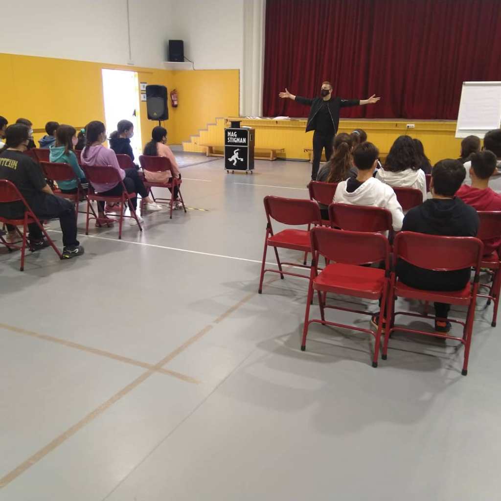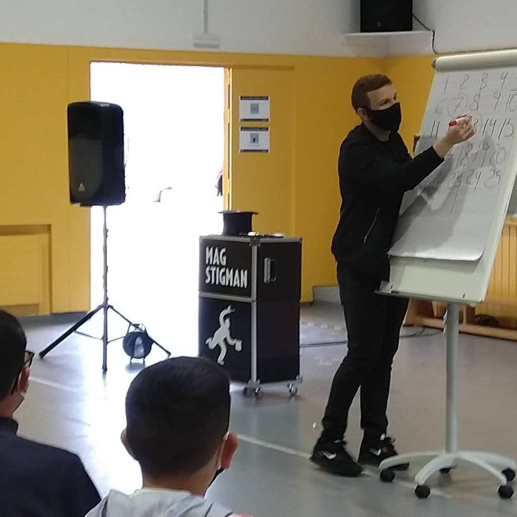 Esta propuesta va dirigida a los alumnos último ciclo de primaria, de la ESO y de bachillerato, y además de ser un espectáculo muy divertido y sorprendente, es una actividad completamente pedagógica. Durante 90 minutos, los estudiantes aprenden razonamiento matemático con elementos de álgebra, cálculo, geometría y topología. Todo mediante sorprendentes trucos de magia. El Mag Stigman sorprende a los alumnos con su buen rollo y con su magia. Y a la vez, encanta a los profesores, ya que ven como sus estudiantes muestran atención y aprenden mucho sobre la aplicabilidad de las matemáticas.