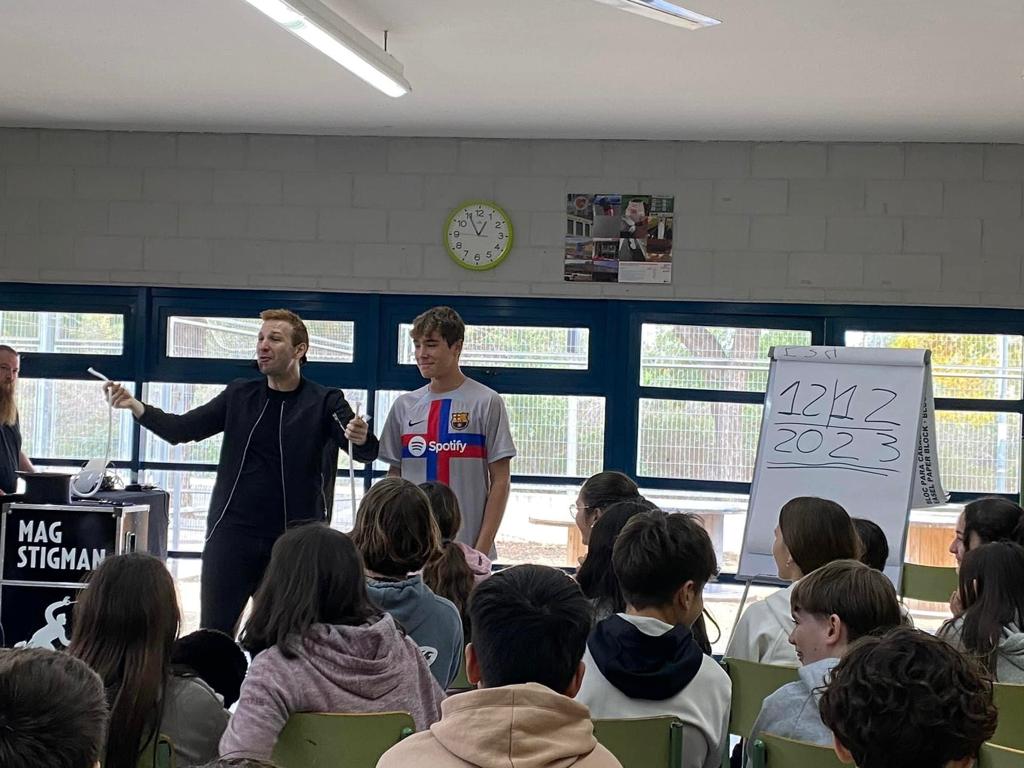 Aunque los fines de semana solemos estar en teatros y estarás acostumbrado a vernos actuar en ellos, al Mago Stigman le encanta también la vertiente pedagógica y hacer estos talleres en institutos y colegios durante la semana. Lo disfruta muchísimo.
