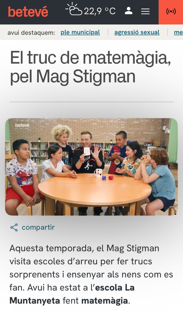 - Segon capítol (Matemàgia a La Muntanyeta): Aquí pots trobar el truc de màgia de la setmana, fet amb els alumnes: https://beteve.cat/catakrac/truc-de-magia-matemagia/